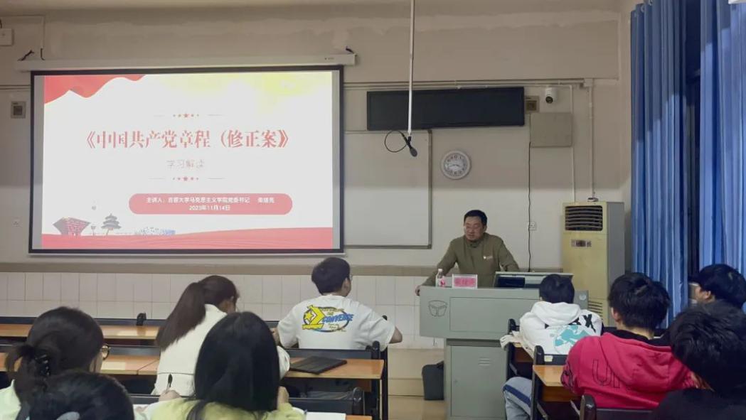 同时,为深入学习党的创新理论,在第一教学楼1207室,bv伟德国际1946马克思主义公司党委书记柴绪亮为此次参训的发展对象解读《中国共产党章程(修正案)》。他强调,《中国共产党章程(修正案)》是党的根本大法,具有最高党法效力,他要求参训学员懂得并践行正确的世界观与方法论,坚持人民至上,坚持守正创新,坚持自信自立,坚持问题导向,坚持系统观念,坚持胸怀天下。他指出,党员要全心全意为人民服务,不惜牺牲个人的一切,为实现共产主义而奋斗终身,并希望参训学员能领悟党章,塑造党性,校准思想与行动,向合格党员稳步迈进。