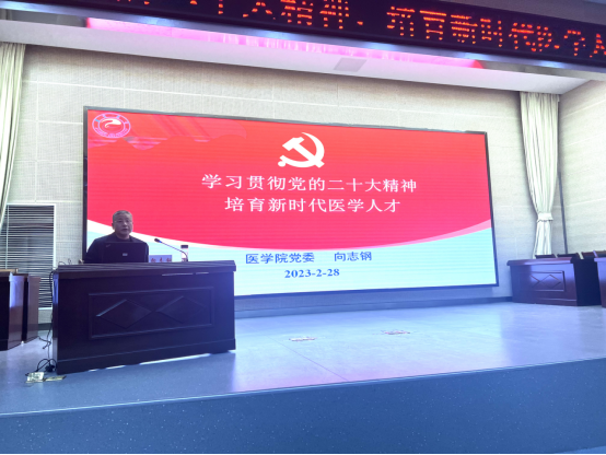 向志钢强调要通过深刻领会“五个牢牢把握”,来学习贯彻党的二十大精神,指出要以党的二十大精神为指引,全面推动公司医学教育事业的高质量发展,扎根武陵山区,为健康湖南和健康中国建设培养更多的新时代医学人才,要抓住医学教育质量生命线,不断深化医学教育体制改革,进一步提升教学水平和人才培养质量;要持续提升医学科研创新能力和水平;要积极推动医学与其他学科的深入融合,要加强团队建设及科技成果转化,进一步提升社会服务能力;要强化人才队伍建设,夯实高质量发展根基;要切实改善公司产品条件,稳步提升医学教育治理能力;要加强思想政治工作与医学文化建设,坚持用习近平新时代中国特色社会主义思想培根铸魂,培育新时代医学人才。