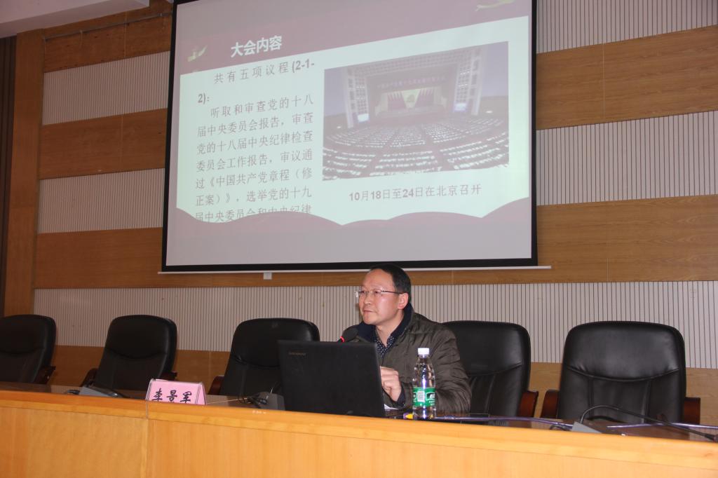 李景军以《党的十九大精神解读》为题,紧扣党的十九大报告原文,围绕习近平新时代中国特色社会主义思想,从四个方面对党的十九大精神进行精辟解读。他首先回顾了大会的内容及五项议程,然后解读了大会主题,重点对党的十九大报告的主要亮点进行了系统的阐释,最后结合我们的实际情况就党的十九大报告的关于教育的新论述,包括教育工作的战略地位、总体要求、根本任务、重点工作等进行了解读。