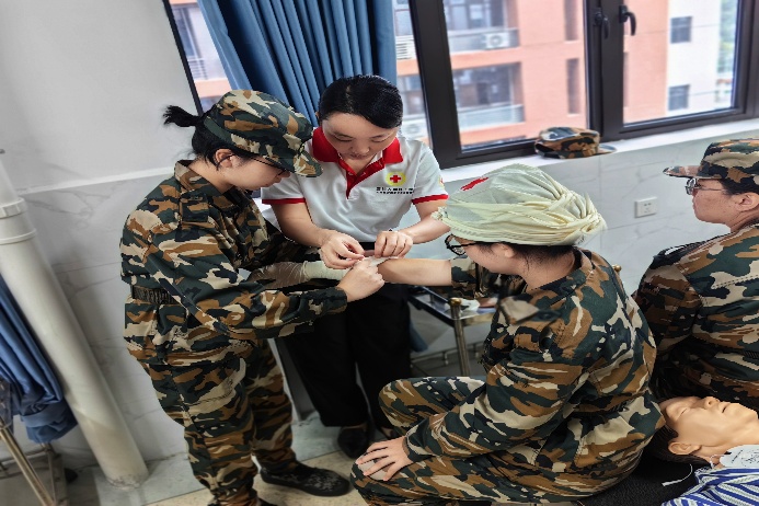 实操课堂中,红十字会讲师以标准跪姿俯身模拟人旁展开示范,手掌交叠、肘部绷直,胸外按压动作连贯规范、节奏精准。在创伤包扎环节,讲师手持三角巾,逐步拆解不同部位包扎方法步骤,并强调其中细节把控。一旁身着迷彩的新生眼神紧紧盯着老师的手部动作,全神贯注的模样充分体现对急救操作规范性的重视。