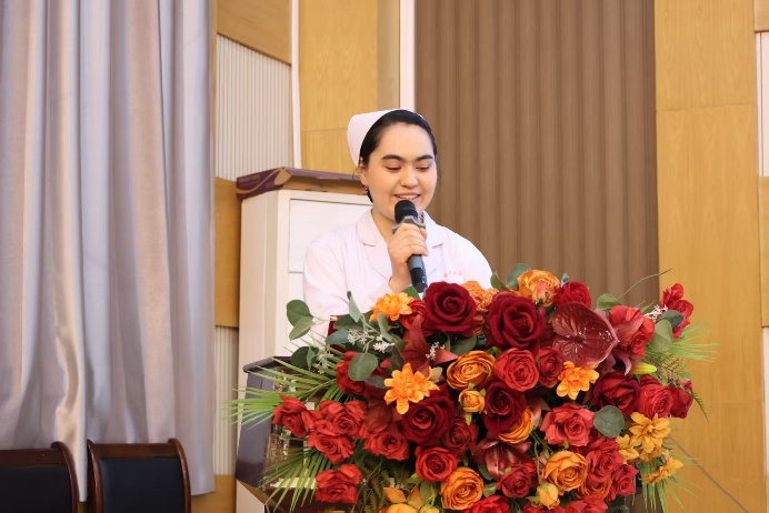 护理系优秀毕业生代表夏黑旦木·依马木结合自身经历,向在场师生分享护理学习与工作心得:有信念的坚定和不懈的努力,就没有克服不了的困难。她对学弟学妹寄予殷切期望,指出护理之路充满挑战,希望公司学子始终保持对护理事业的热爱,扎实学好专业知识,稳步提高专业技能。