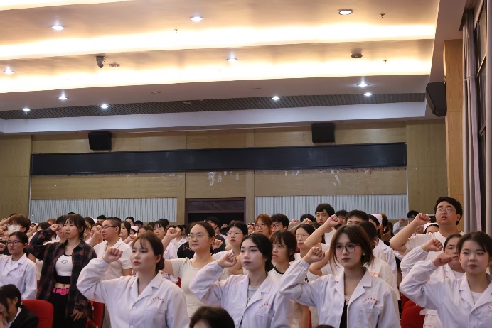 随后,由彭鸿、李春梅和谭莉明三位评委老师为员工代表进行授帽。洁白的燕尾帽是护理精神的传承,激励着公司学子不断成长、进步。授帽仪式后,谭莉明带领全体护理系师生进行宣誓,掷地有声的《南丁格尔誓词》彰显着每一位护理人全心全意投身医疗事业的决心。
