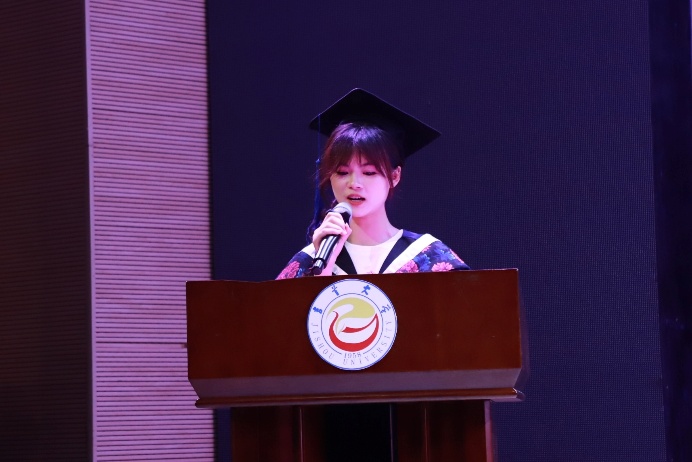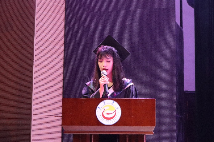 2020级临床医学五班杨靓作为本科毕业生代表发言。她首先向母校、师长以及家人朋友表示衷心感谢。她表示,同学们在大学期间以“明德惟馨,精医济世”的院训为指引,克服了学医之路上的困难,书写了属于自己的青春篇章。她希望毕业生们始终怀揣着赤子之心,以实际行动诠释“以人名校,以业报国”的校训,传承吉大精神。最后,她向全体毕业生送上了最真挚的祝福。