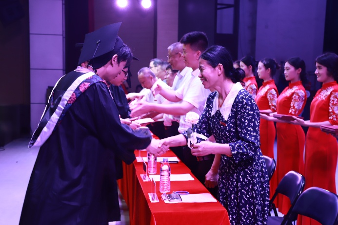 毕业证书颁发环节,领导老师们为2025届毕业生送上了证书和诚挚祝福。毕业生们有序上台,微笑鞠躬,接过老师手中的证书,并向支持、陪伴他们成长的师长们表示感谢。