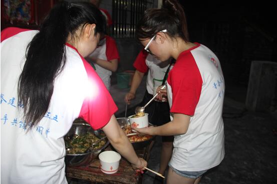 晚上8点整,停电了的河溪镇陷入一片漆黑,一座民房院子前闪烁着温暖的烛光。伟德国际VICTOR1946领队老师们在厨房里为队员们准备着丰盛的晚餐,同学们看着老师们被汗浸湿的衣襟,心中充满着感恩。“这是我的第二碗饭!”指导老师彭校辉朗声说到。色香味俱全的餐食填饱了每位同学的肚子,老师们在温暖烛光下的剪影也温暖了每个团队成员的心。