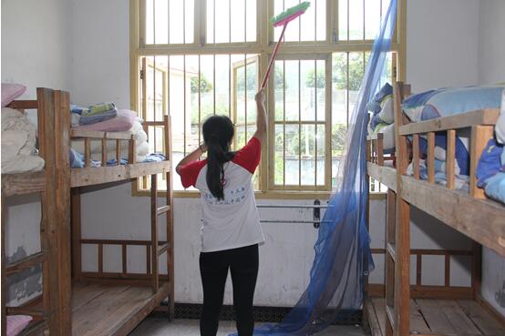 “看这些老员工,这么热的天,怕是一天也坚持不了。”看着志愿者们顶着烈日,扛着行李住进河溪镇河溪小学,在小学门口乘凉的“李大叔”说到。“刚刚来怎么就停电了!”有同学感叹道。毒辣的太阳烘烤着河溪的大地,同学们的衣服干了又湿,湿了又干,可是都没有停下手中的事,“大家分工合作赶快把卫生打扫干净。”带队老师李继红说到。老师们也动手和同学们一起整理宿舍,看着变得整洁的宿舍,都露出了欣慰的笑。