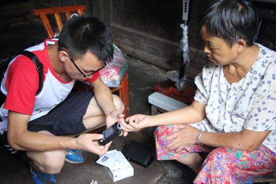图为志愿者为石凤仙婆婆测血糖 (许梦霞摄)