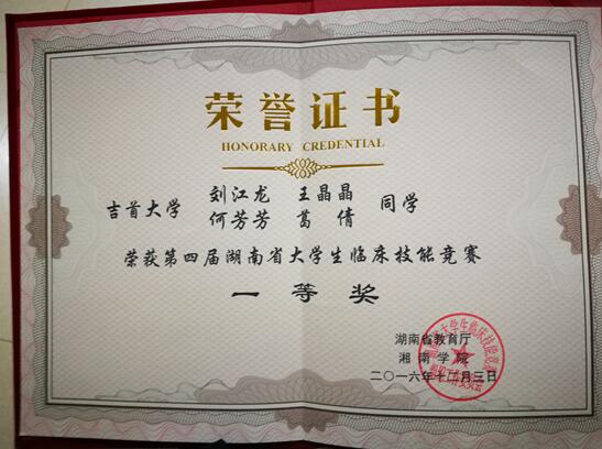 由刘江龙、王晶晶、何芳芳、葛倩组成的bv伟德国际1946一队顽强拼搏,历经3轮苦战,总分排名第二的优异成绩获得了一等奖,仅次于中南大学,该队还获得了“消毒铺巾”项目的单项奖。由卢春霞、石紫薇、彭建华、石芳组成的bv伟德国际1946二队获得三等奖,并获得了“缝合打结”项目单项奖。