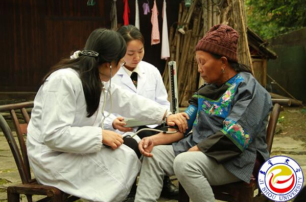 图为伟德国际VICTOR1946老师为村里患病老人做基础检查
