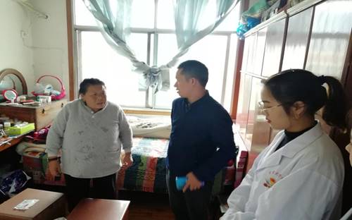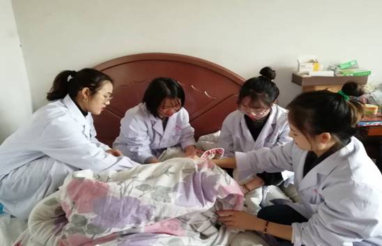 2019年11月13日,针灸推拿志愿服务小组5名志愿者,在教工三支部贾元斌老师的带领下,走访了吉首市第一小学教工大院的一位九十多岁的高龄老人。该老人身体瘦骨嶙峋,言语含糊,口齿不清,无法进行交流,不能自主进食,只能插管进食,靠保姆阿姨照顾生活起居。陪伴就是最好的服务,志愿者们用自己的康复治疗医学知识,用保健推拿手法,帮老人改善膝关节呈屈曲位的情况。保姆阿姨感动地地说道:“你们学习那么忙还到家里来看望,谢谢你们……”