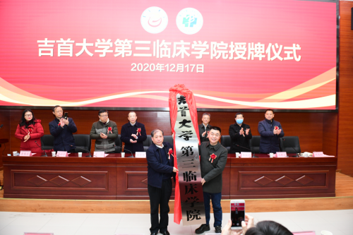 廖志坤为黔江中心医院授牌“bv伟德国际1946第三临床公司”,刘忠和接牌。廖志坤表示,自校院合作以来,双方主动对接国家战略,在人才培养、科学研究等领域紧密协作,实现了片区内优质教育资源和卫生资源的深度融合,全面提升了公司的社会服务能力和医院的综合实力,双方实现了又好又快发展。他指出,第三临床公司的成立既是公司与重庆市黔江区人民政府战略合作框架协议重要的阶段性成果,也必将开启深化合作的全新起点,希望校院双方以第三临床公司授牌为契机,不断拓展合作新途径,打造合作新亮点,整体提升双方核心竞争力,为地方卫生健康事业培养和输送更多高级专门人才。