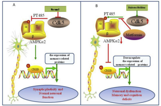 糖尿病脑损伤(diabetic brain damage),是糖尿病并发症之一,也被称为“3型糖尿病” 其临床症状表现为学习记忆认知障碍,目前对于加速糖尿病脑损伤进程的内在分子机制尚不清楚。课题组通过蛋白组测序及生物信息学分析发现,细胞内控制能量代谢的关键分子AMPK-α2激酶的活性受到Cdk5激酶的负调控,进一步的体外突变和细胞实验发现Cdk5通过调控AMPK-α2激酶485位点的磷酸化使其失活,引发脑内海马区神经元形态结构及其功能异常,加速脑损伤进程。体外Cdk5激酶阻断剂或AMPK-α2激酶抑制剂的干预实验结果也都佐证了上述结论。该研究结果为临床治疗糖尿病脑损伤的药物研发提供了新靶标。