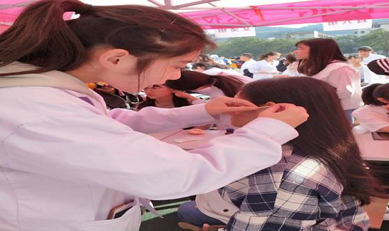 本网讯(本网讯欧安清,指导老师:李中正)2019年11月3日,为扎实推进“不忘初心、牢记使命”主题教育,发挥党员先锋模范作用,为群众办实事好事,在校体育运动委员会的支持下,公司党委精心组织针灸推拿系及护理系10位专业教师,在校运动会田径比赛期间,带须52名员工党员及入党积极分子,为全校运动员、裁判员、工作人员、教职工及家属,开展保健推拿按摩、血压健康管理、针灸、康复、艾灸、耳穴敷贴、火罐等特色中医健康服务,有效预防及治疗赛前紧张、精神不振、赛后疲劳、肌肉酸痛、肌肉痉挛、肌肉劳损、失眠等运动性亚健康症状,关爱群众健康,方便群众,服务群众。