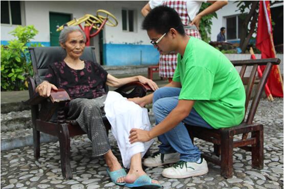 等待老人们用过早饭以后,待老人们休息一会儿过后,志愿者们开始义诊与调研。敬老院的老人们大多是腿脚不便,志愿者们搀扶着老人们坐在院子里,为他们一一进行问诊与治疗。其中有一位年过九旬的老人骨瘦如柴,对其进行推拿的一位志愿者吴大州说“我不敢用力,因为怕弄伤奶奶,我会更加小心谨慎的。”另一位带着很多医院就诊的报告的老人在接受过腿部推拿之后开心地说道“我的腿好了,你们这个太有用了,我都能自己站起来了。不用扶,不用扶。”一个人最开心的笑容就是对你最真的认可。