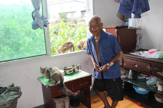 在活动过程中,看见一群猫在一间房间里。没有想过是敬老院一个老爷爷养的,也没有在意,再一次看向那间房间时,发现有几只猫正站在窗台上吃食物,而一旁是一位老爷爷在喂食。老爷爷说“进来拍吧,有一只尾巴特别长的猫,像狐狸尾巴,要我进来了你才能看见它。”“好的素材要抓拍连拍按快门,你的技术还不行啊,我女儿最喜欢拍照了。”老爷爷笑着对我说道,可以感受到他对他的女儿深深的爱意。